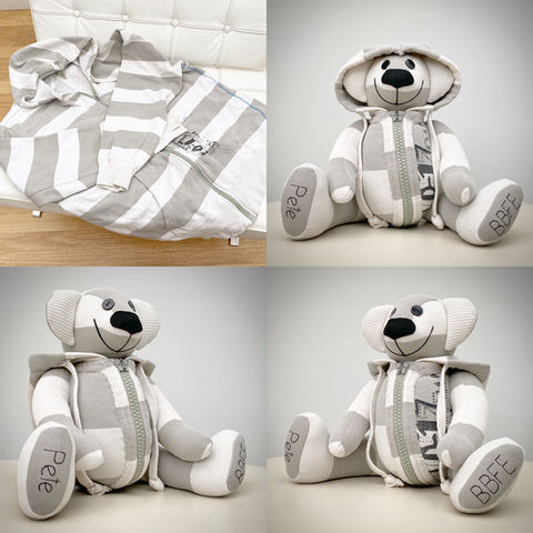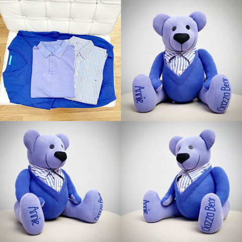 Memory Bears are made by hand, by using material supplied by yourself. With three sizes available. Look at our FAQ for a guide of how many items of clothing are required for each bear. Clothes need to be clean & in a reasonable state. Clothing that is too worn will impact on the quality of the finished product.​